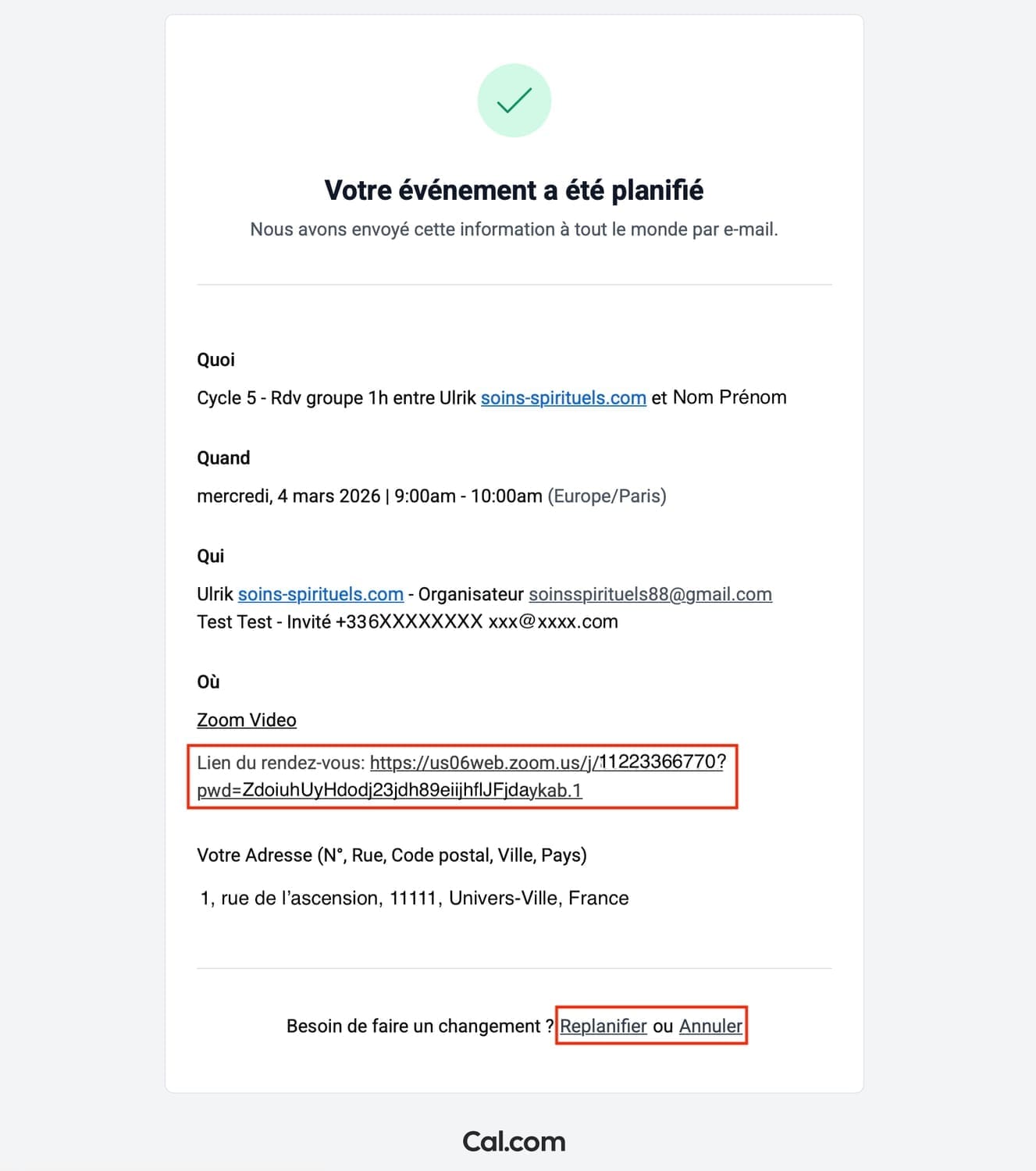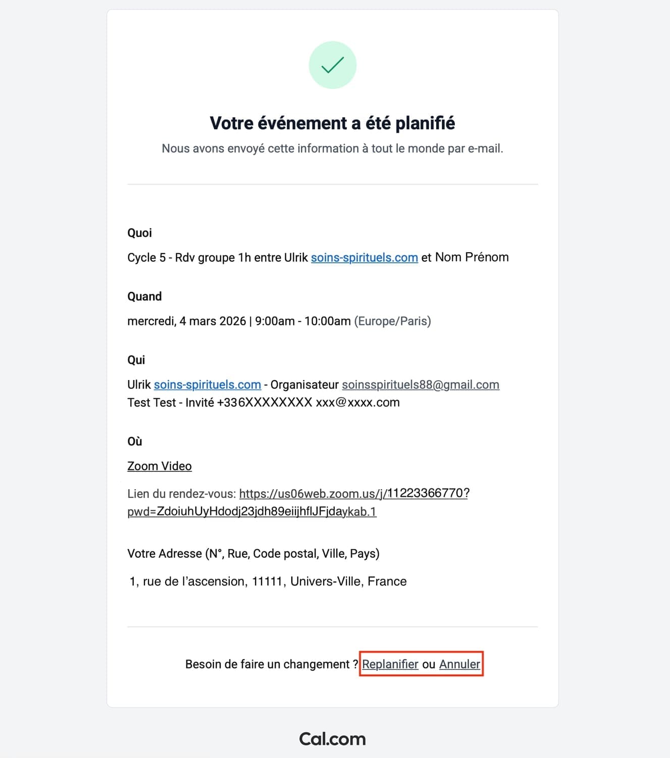 À la suite de la prise de votre rendez-vous, vous recevez un mail de confirmation de hello@cal.com.