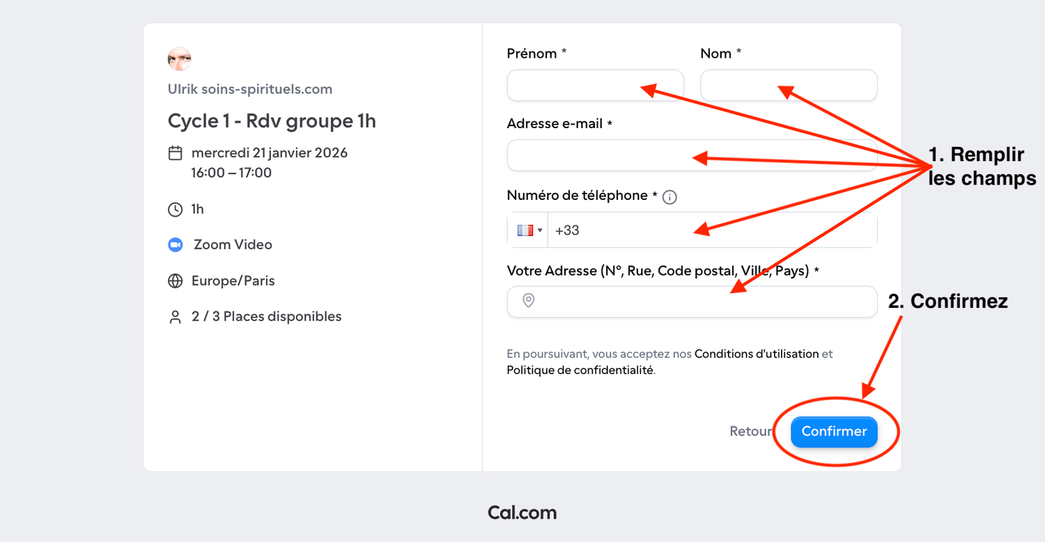 Entrez maintenant vos coordonnées sur la page comme demandé puis cliquez sur CONFIRMER afin de valider votre rendez-vous